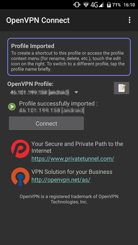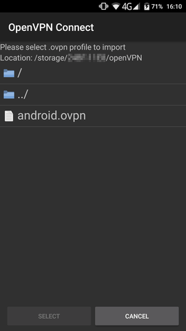 /root/android.ovpn) to your Android device (e.g. SD card) and import it in the app: